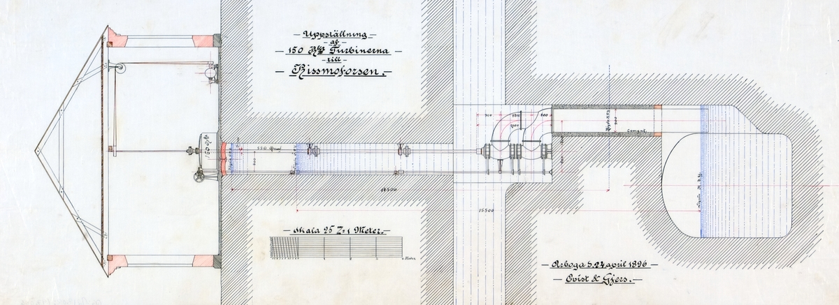 Ritning. Uppställning av turbinerna till Hissmoforsen.