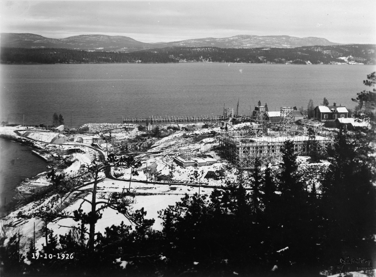 Titel: Byggherre: Byggnadsaktiebolaget Contractor, Stockholm. Sulfatfabrik i Dynäs i Ådalen för Sandvikens Cellulosa AB. Entreprenaden innefattade fabriksbyggnader, pir och massamagasin. Arbetsbild.