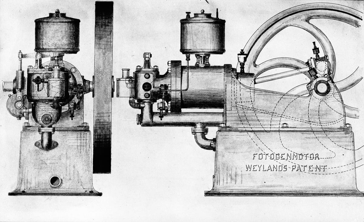 Ritning till en 8 hk fotogenmotor.Weylands patent Stockholm november 1892.