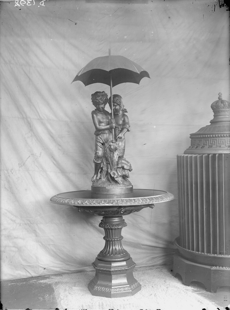 Liten staty (flicka+pojke+paraply) på runt bord.
