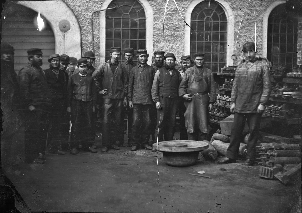 Arbetare utanför Bolinders Mekaniska Verkstad.