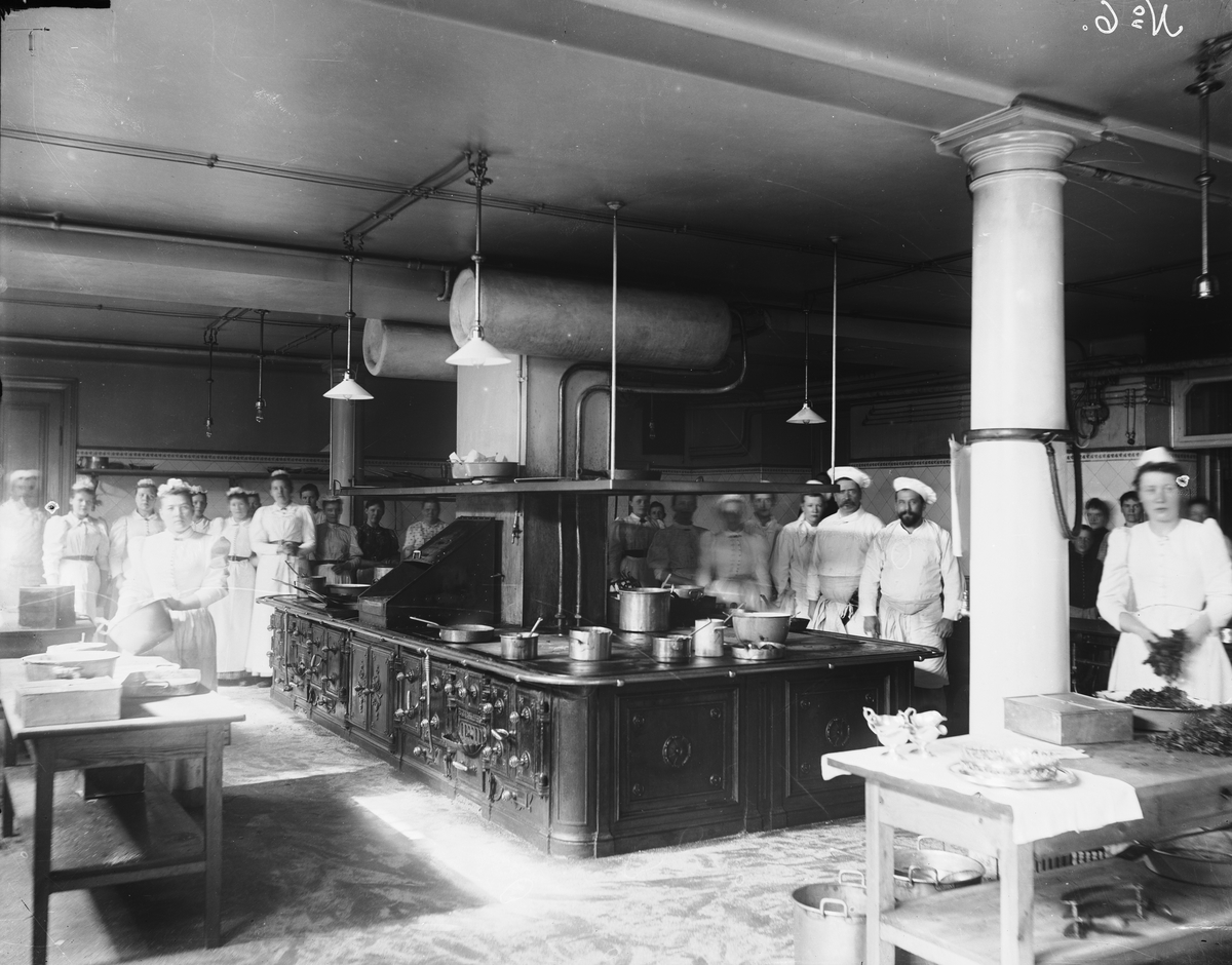Interiör från ett restaurangkök, med personal.