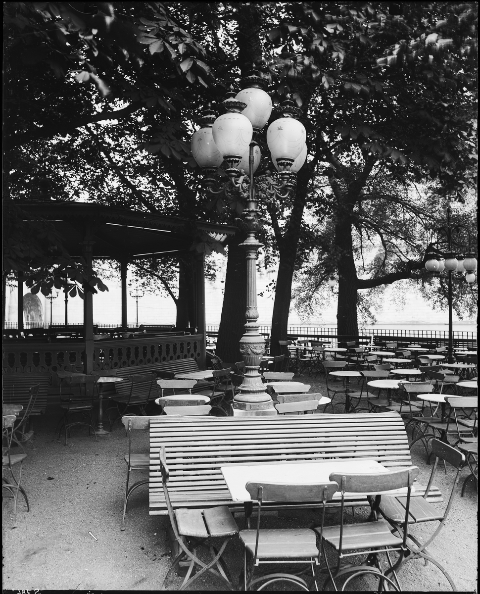 Uteservering. Stolpe med sex gaslyktor.