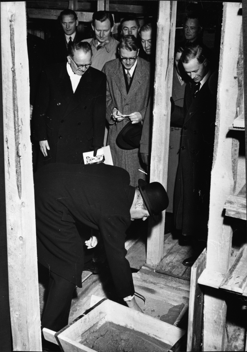 Byggherre: Byggnadsaktiebolaget Contractor, Stockholm. Kronprins Olav murade in ett dokumentskrin med dagens mynt och tidningar samt redogörelse för byggnadens tillkomst och utförande.