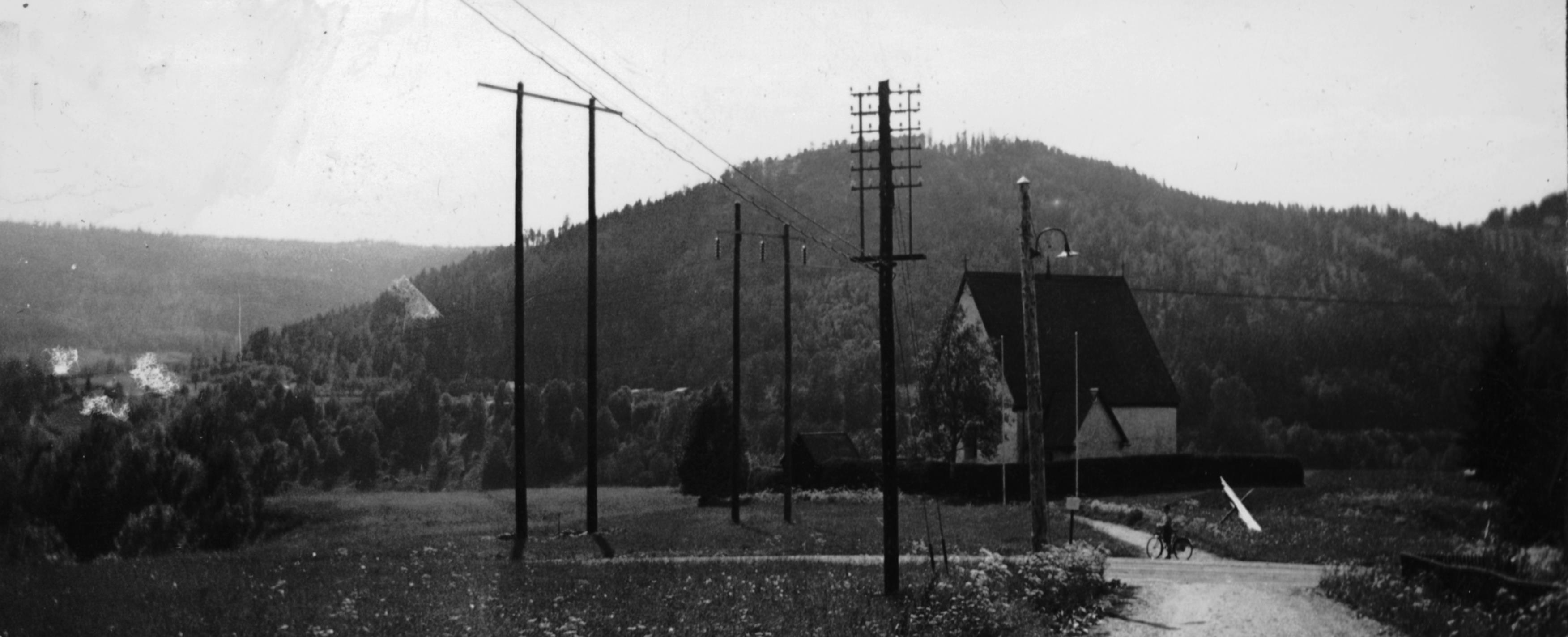 Beskrivning: Kyrkan från nordöst. Bilden avser att illustrera kraftledningens läge i förhållande till kyrkan.
