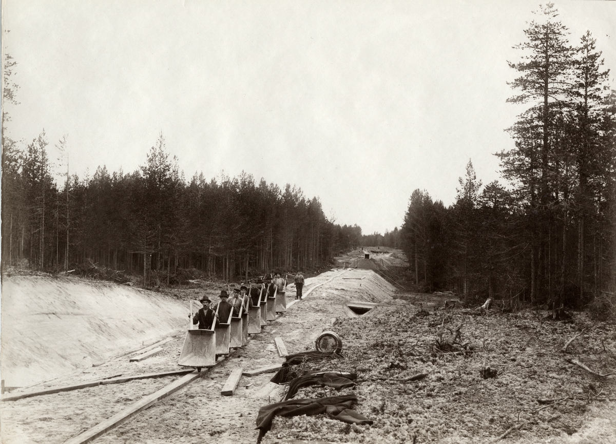 Anläggande av Luleå Jernverk. Män med skottkärror. Ur album: Fotografier Luleå Jernverks Aktiebolag.