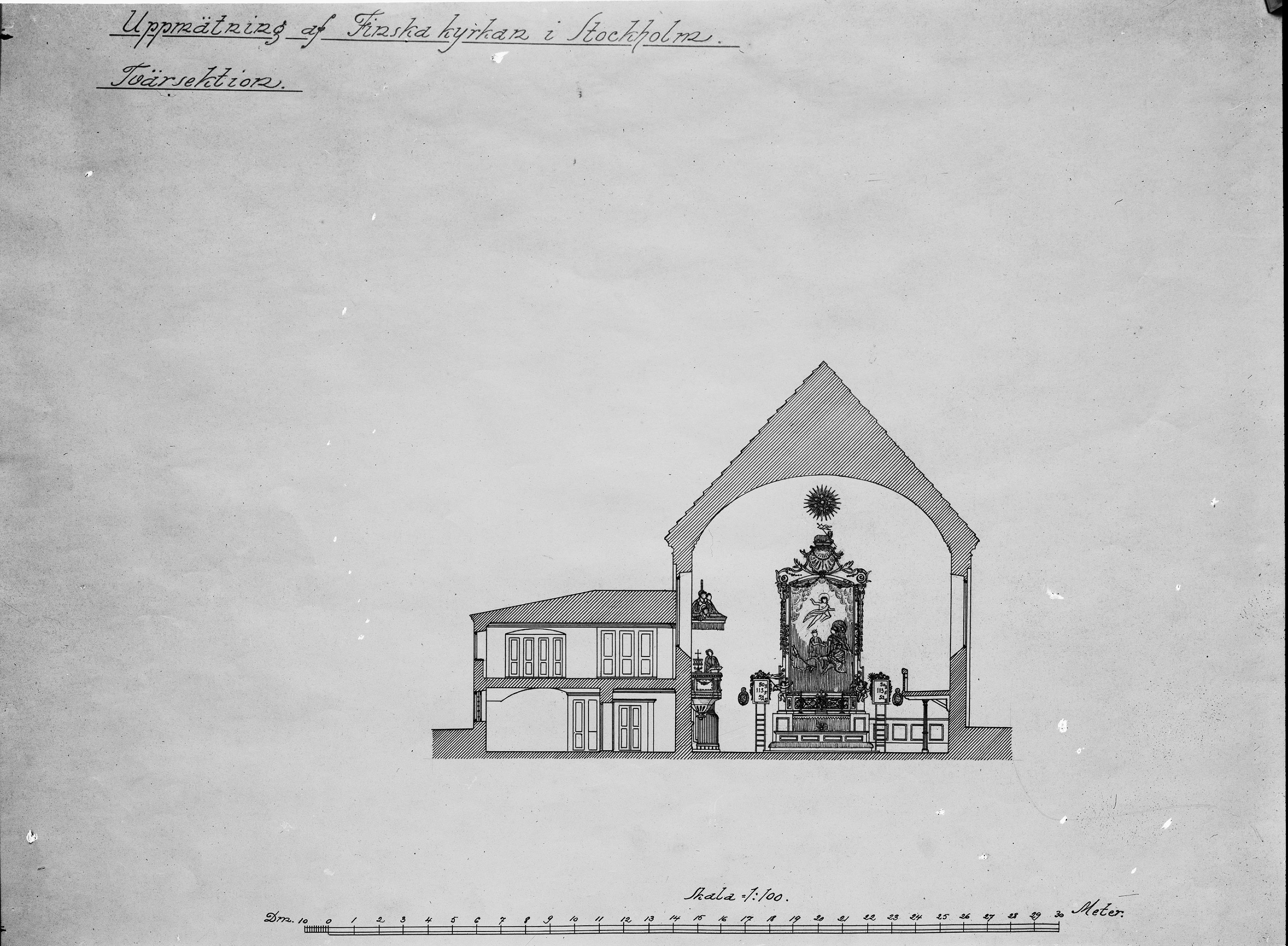 Ritning, tvärsektion, kyrkans östra parti. Foto efter uppmätningsritning i pastorsämbetet.