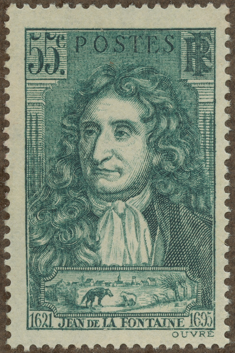 Frimärke från Frankrike, 1938. Motiv av Jean de La Fontaine 1621-1695. Författare Fabler