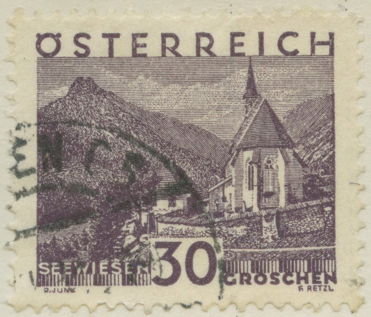Frimärke från Österrike, 1929. Motiv av Seewiesen, Kyrka i Steimark.