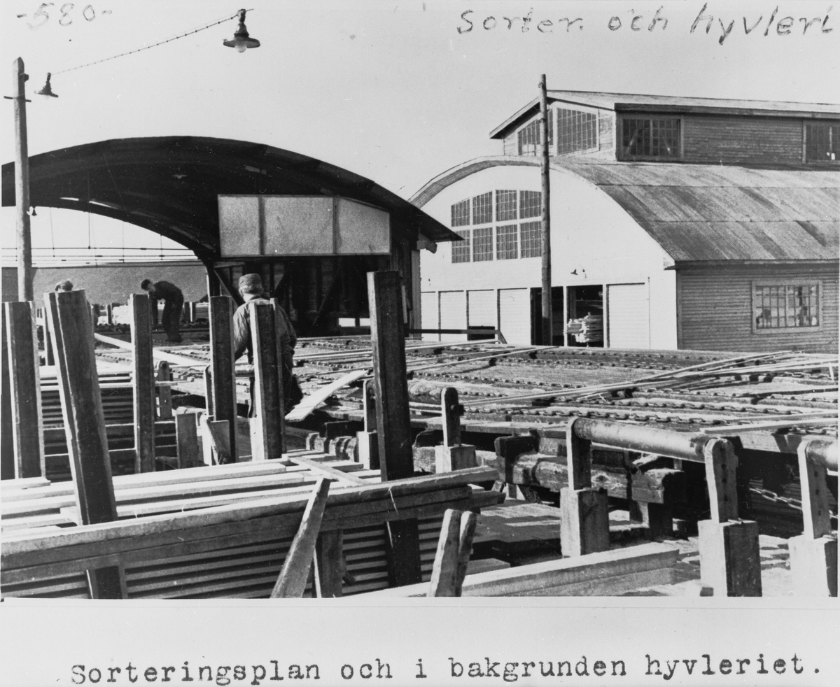 Exteriör. Sorteringsplan och i bakgrunden hyvleriet, Munksunds Sågverk, Holmsunds AB.