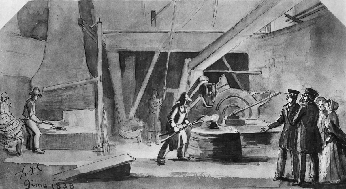 Vallonsmedjan. Reprobild av en lavering av Fritz von Dardel omkring 1838. >>