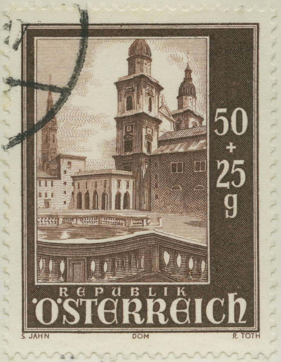 Frimärke från Österrike, 1948. Motiv av Salzburgerdomen. "Serie till förmån för katedralens restauration".