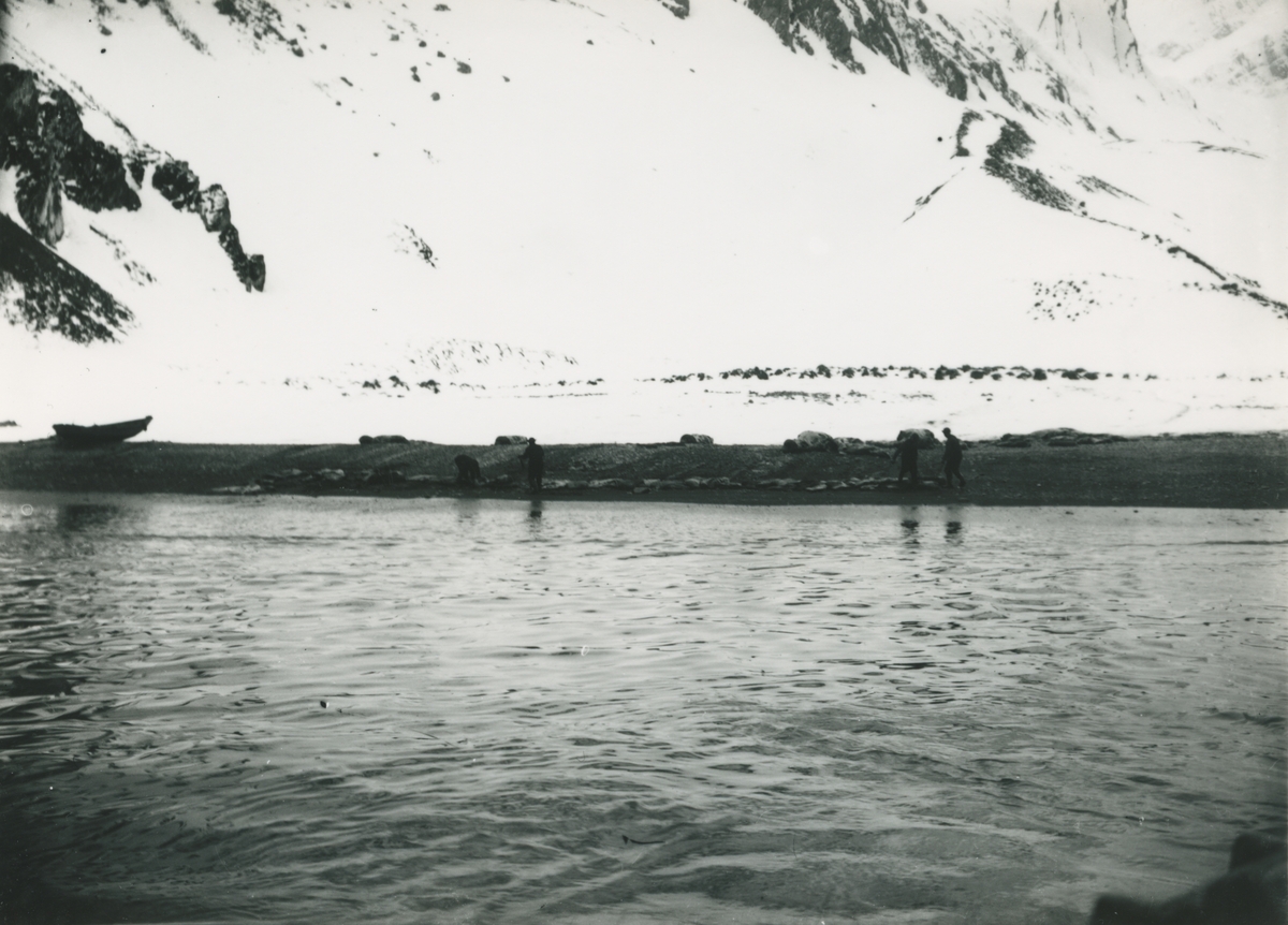 Bild från expedition i Antarktisområdet. Motiv av män på strand nedanför snötäckt berg.