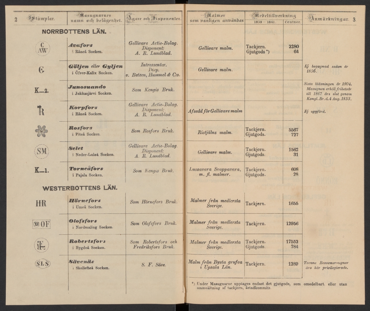 Stämpelbok för Svenska Järnverken 1864, med supplement 1867.
