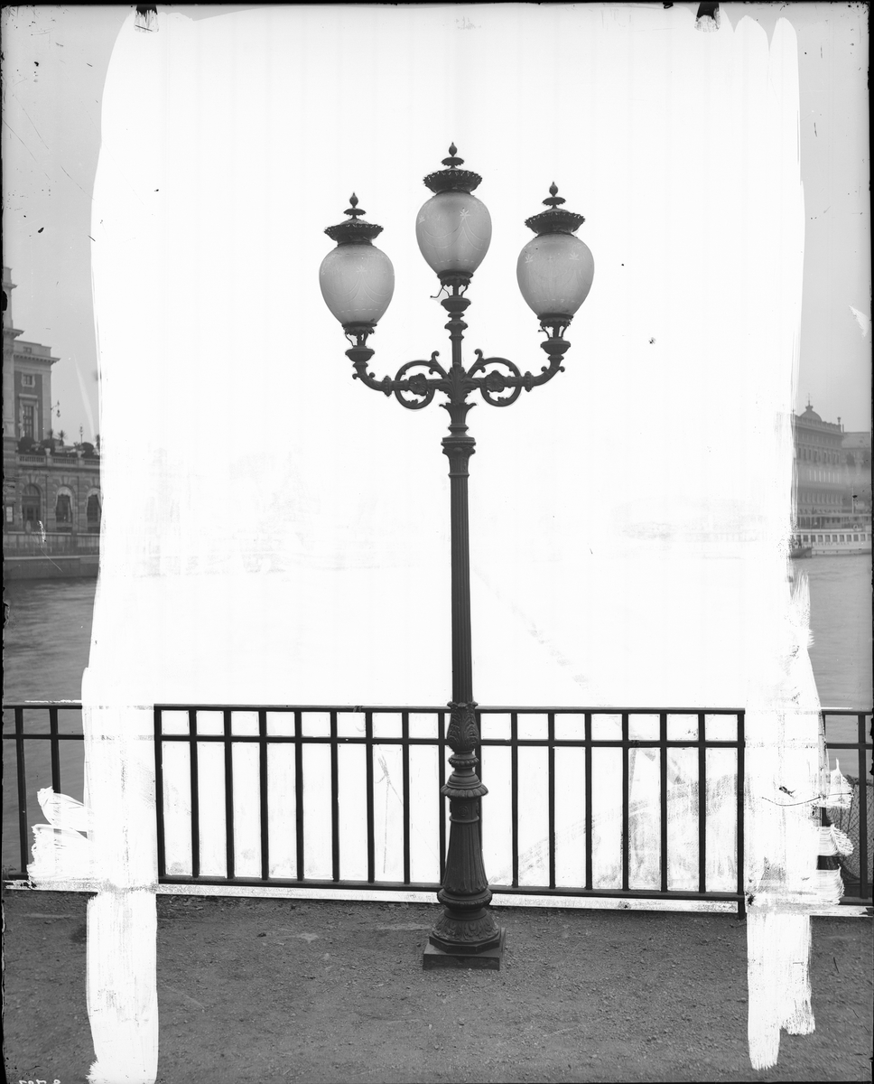 Stolpe med tre gaslyktor. Retuscherad bild.