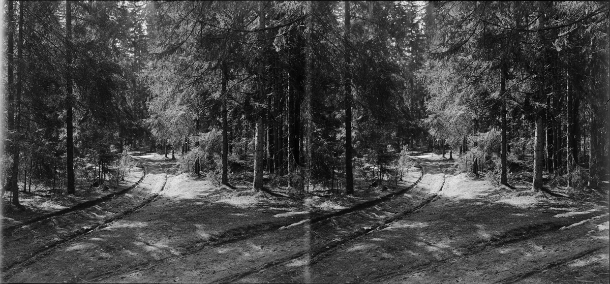 Stereonegativ, skogsväg som förgrenar sig till två, södra Dalarna.