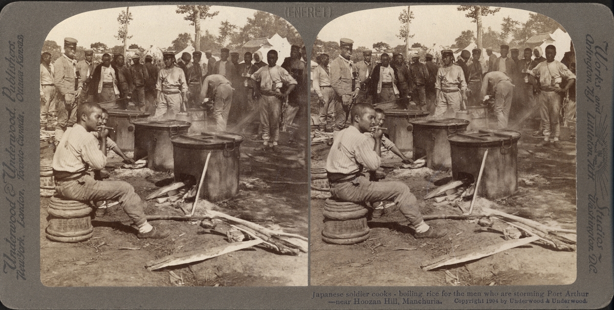 Stereobild av Japanska soldater som kokar ris i lägret vid Hoozan Hill, Manchurian.