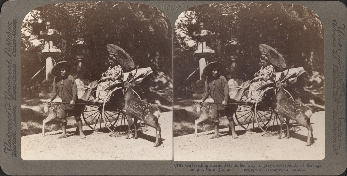 Stereobild av kvinna med parasoll i kärra dragen av man, som hälsar på två rådjur på vägen till Kasuga Tempel, Nara, Japan.