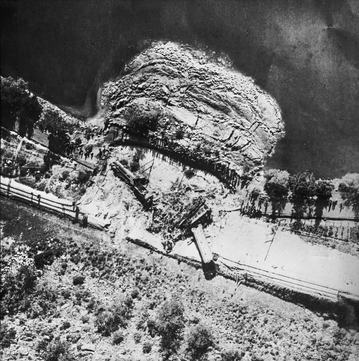 Ljusbild, flygfoto av järnvägsolyckan vid Getå vid Bråviken, Östergötland 1918.