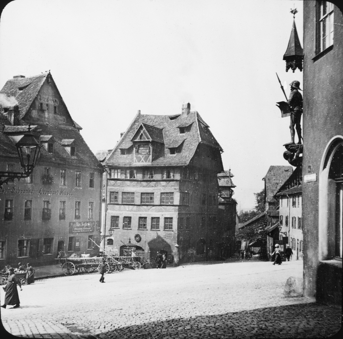 Skioptikonbild med motiv av Dürerhaus (teater?), vid torg i Nürnberg.