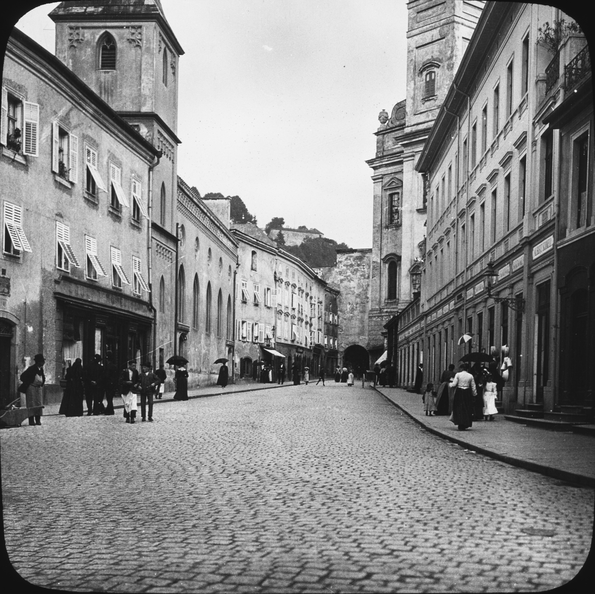 Skioptikonbild med motiv från gata med tunnelmynning i Salzburg.