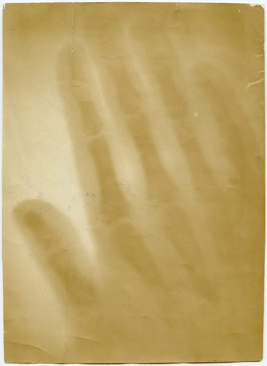 Kopia av röntgenplåt tagen av Frithiof Holmgrens hand på Professor Thaléns laboratorium i Uppsala. En av de första röntgenupptagningarna i Sverige, 1896 eller 1897.