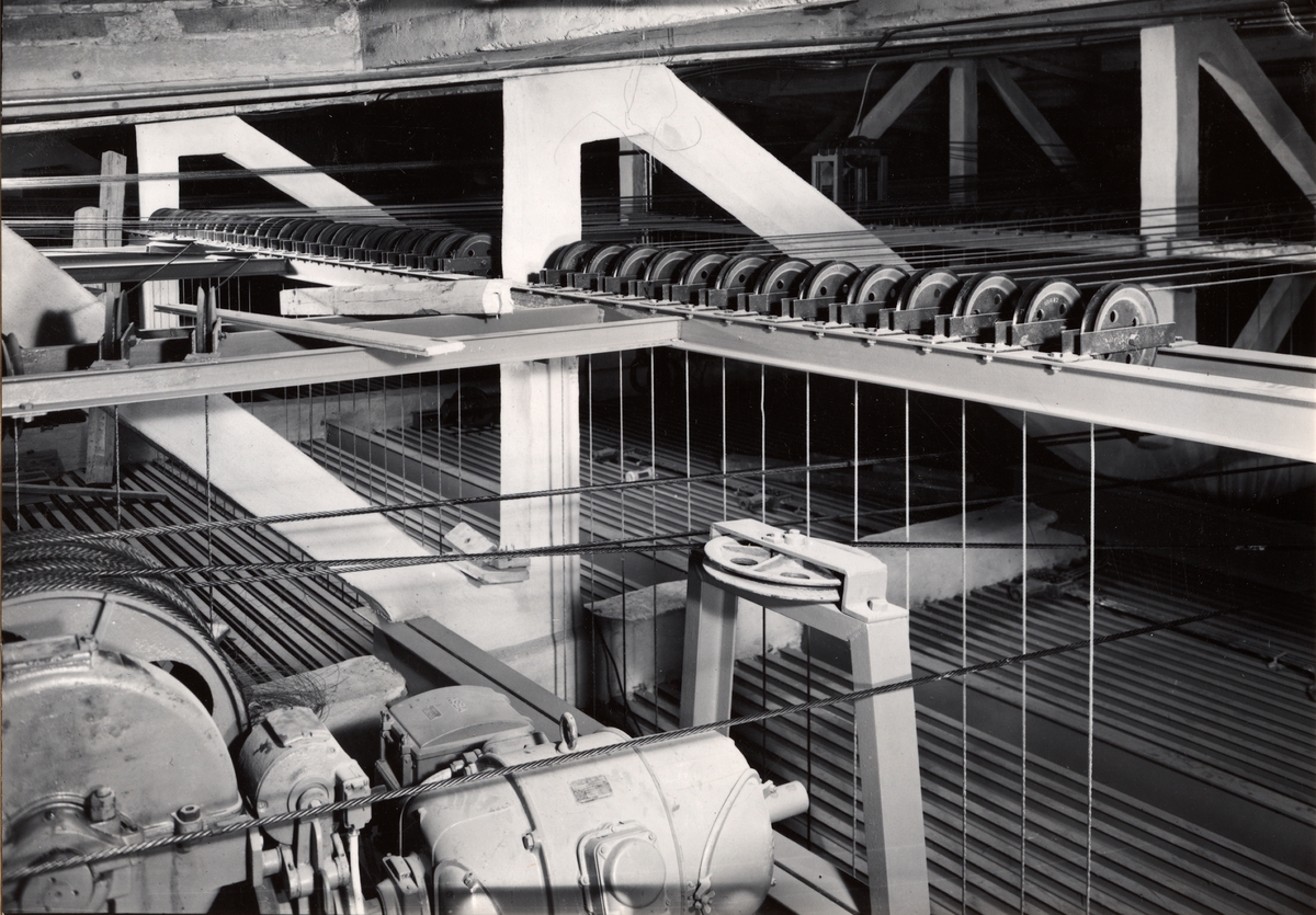 Tågvinden i Malmö Stadsteater. Vid tiden Europas modernaste scenmaskineri. Konstruktionena utarbetades av Götaverken i samråd med regissör Knut Ström, Göteborg samt arkitekterna Lallerstedt, Helldén och Lewerentz, 1944.