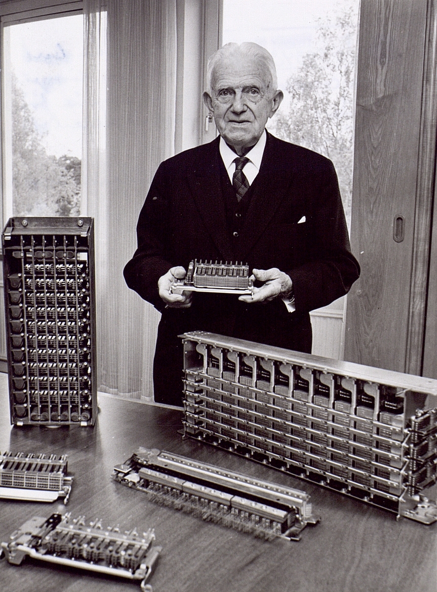 Ingenjör Nils Palmgren bredvid koordinatväljare från 1919 respektive 1969.