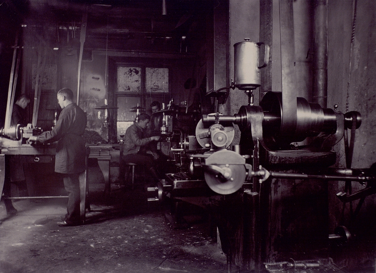 Telegrafverkets verkstad vid Fiskargatan i Stockholm. Interiör från 1895.