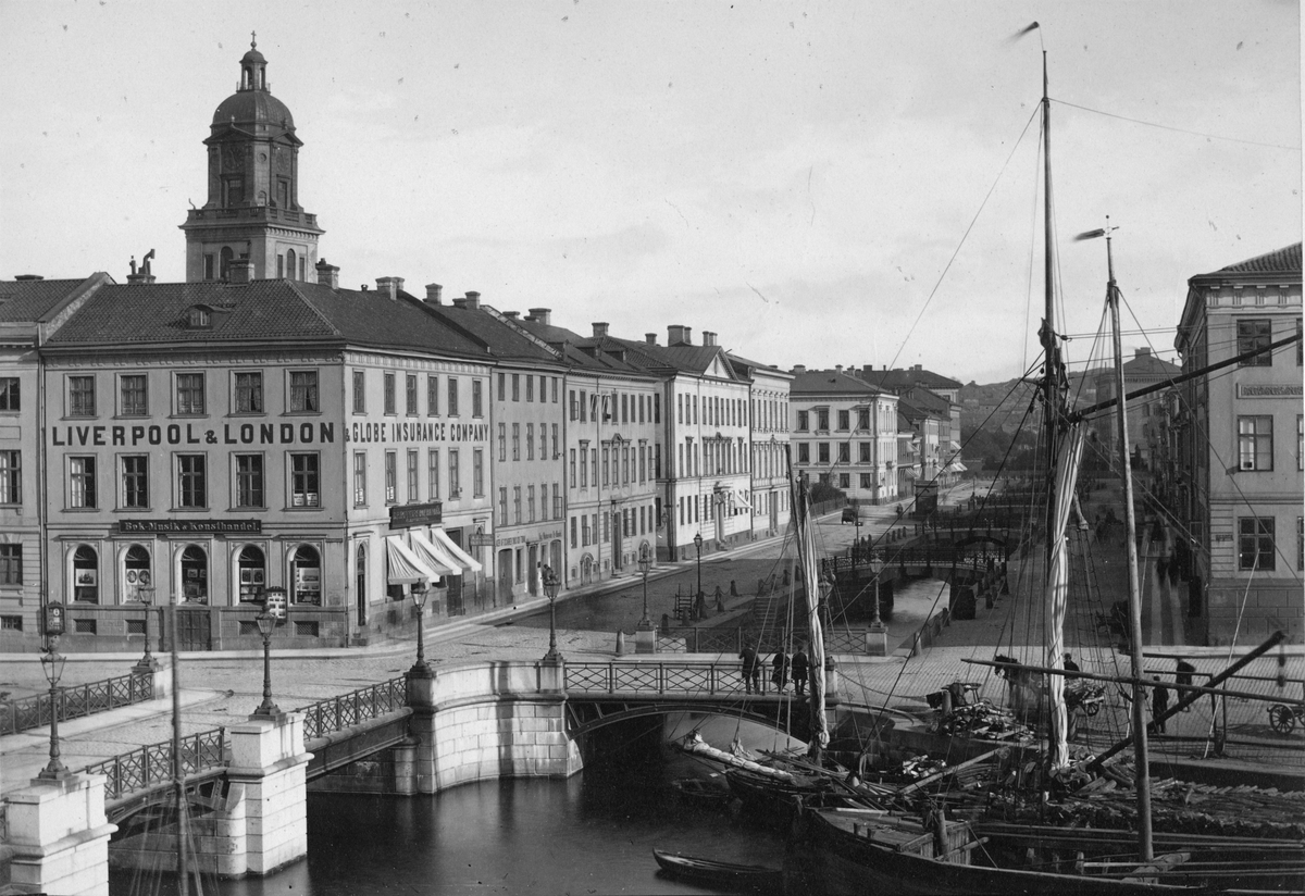 Vestra Hamngatan (Västra Hamngatan) i Göteborg. På bilden syns bland annat Företaget Liverpool & London Globe Insurance Companys byggnad.