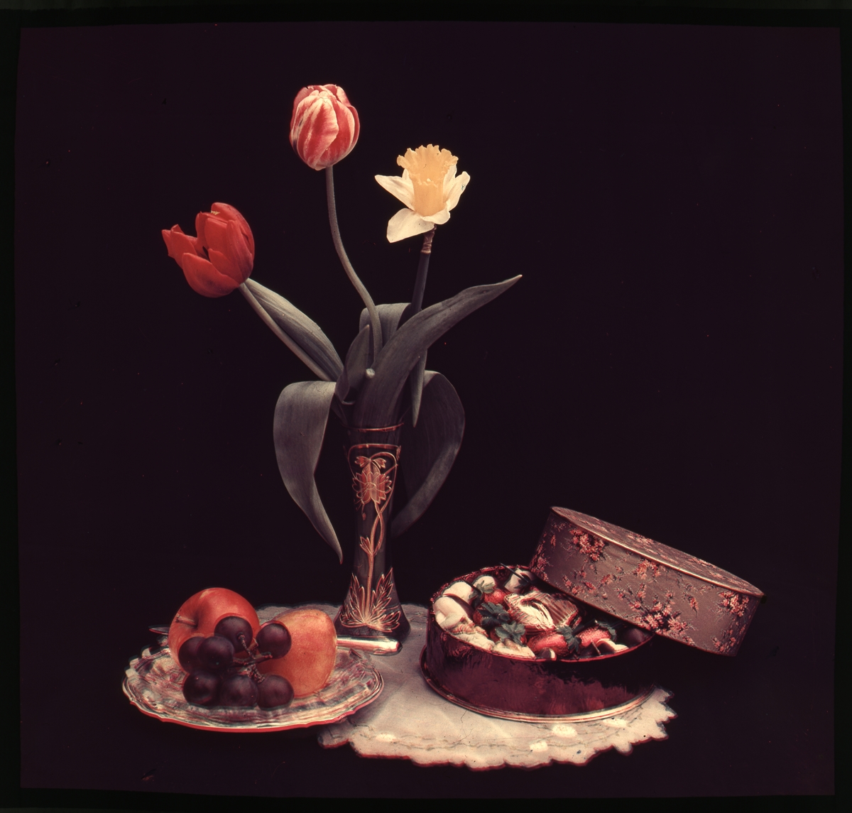 Autokrom. Stilleben med motiv av tulpaner och choklad. Negativ av J. Hertzberg överförda till gelatinreliefer på Agfa Anaglyffilm, infärgade med pinatypiefärger.