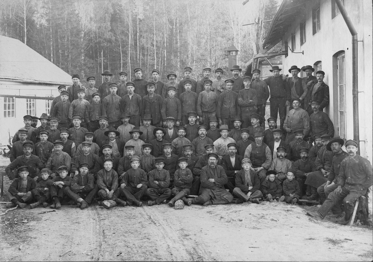 Gruppbild av arbetare vid Blombacka bruk i Värmland.