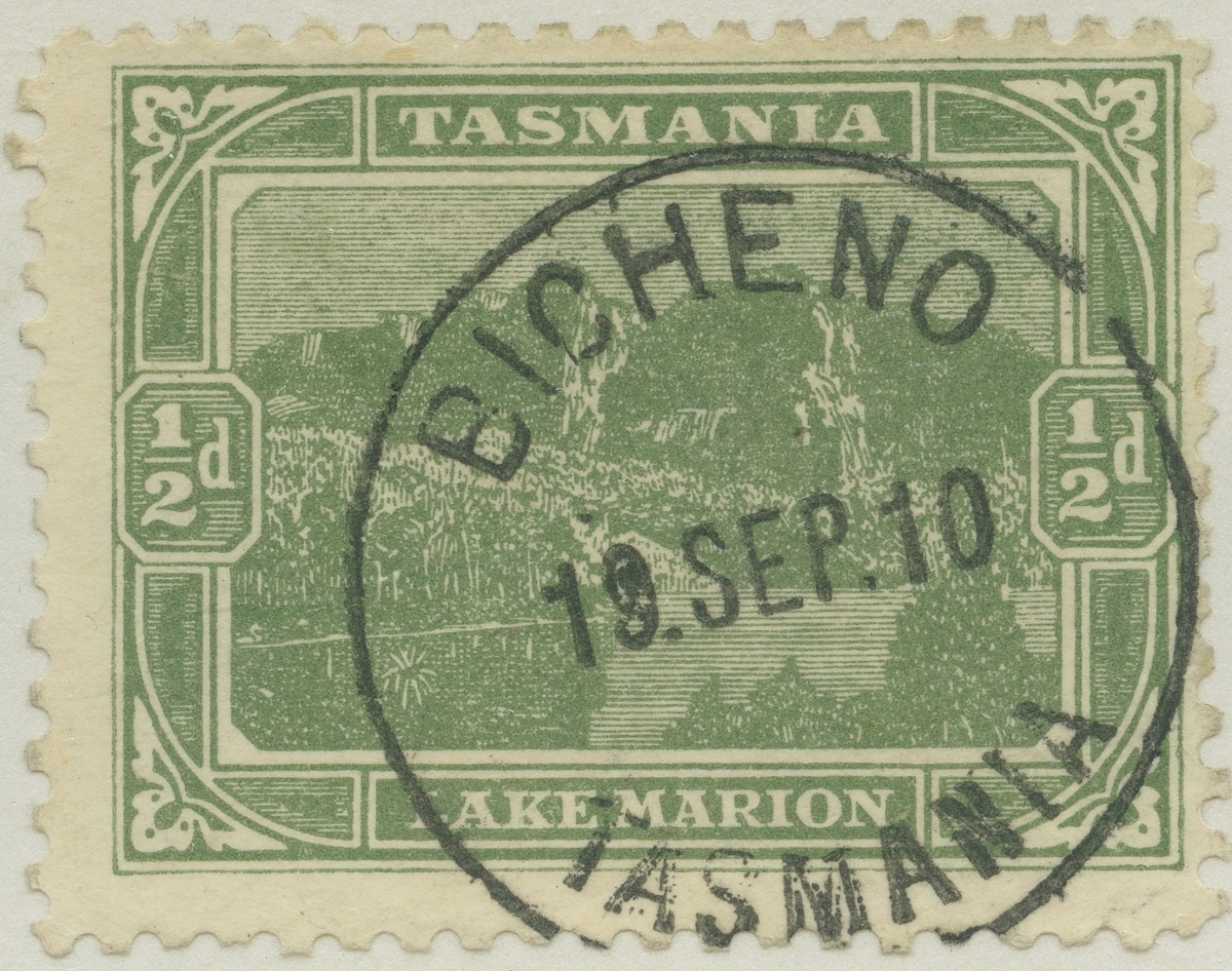 Frimärke ur Gösta Bodmans filatelistiska motivsamling, påbörjad 1950. Frimärke från Tasmanien, 1899. Motiv av Sjön Marion i Tasmanien "-f.d. brittisk koloni, inkorp. 1901 med Australien-"