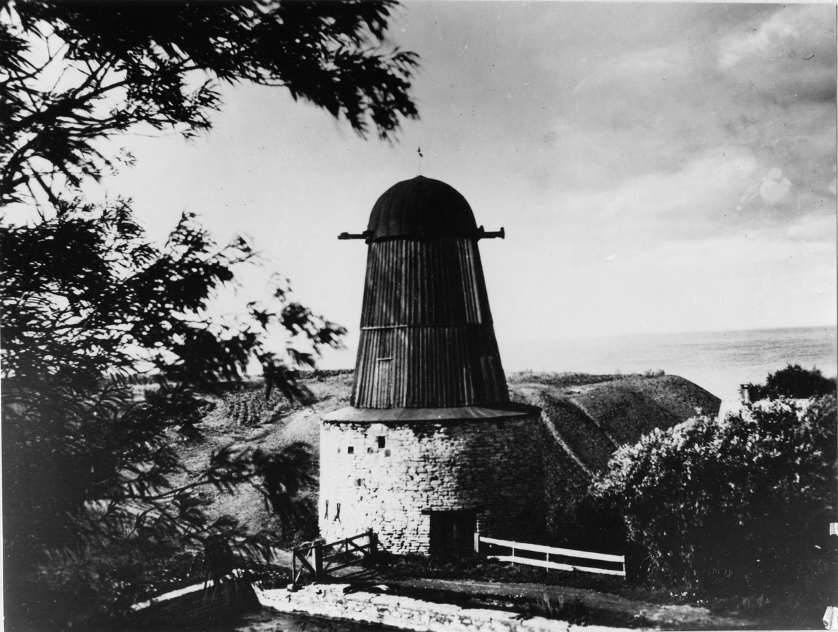 Ölands Alunverk. Pumpverk i kombination med en holländsk väderkvarn. I bakgrunden till vänster askhögar, härrörande från aluntillverkningen.