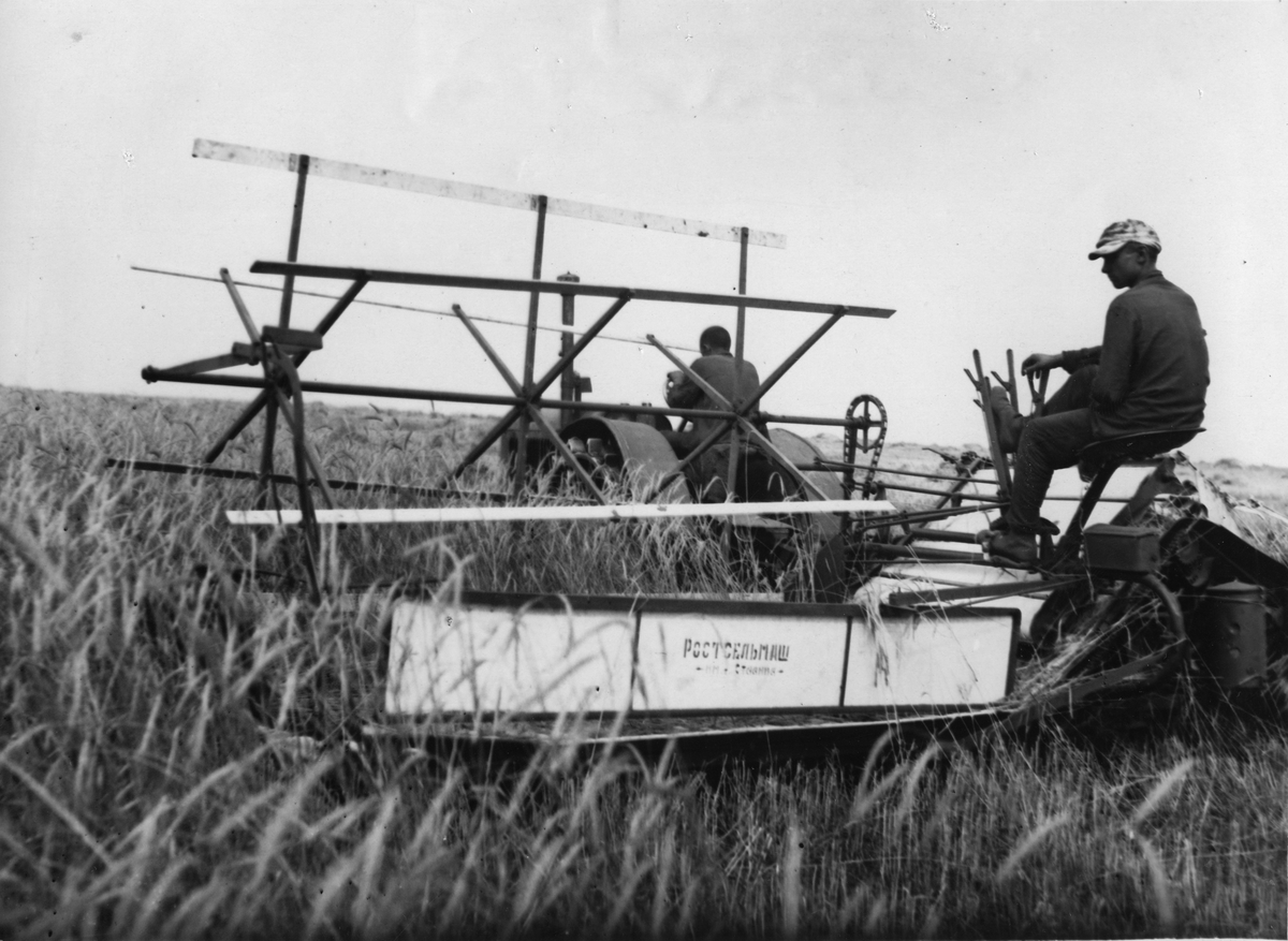 Jordbruksmaskin vid Lantbruksutställningen i Moskva. Sovjetiska maskiner på kolkhosernas fält. Jordbruksmaskinen "Rostelmajs" som tillhör kolkhosen "12 oktober" i Urjupinsk-delen.