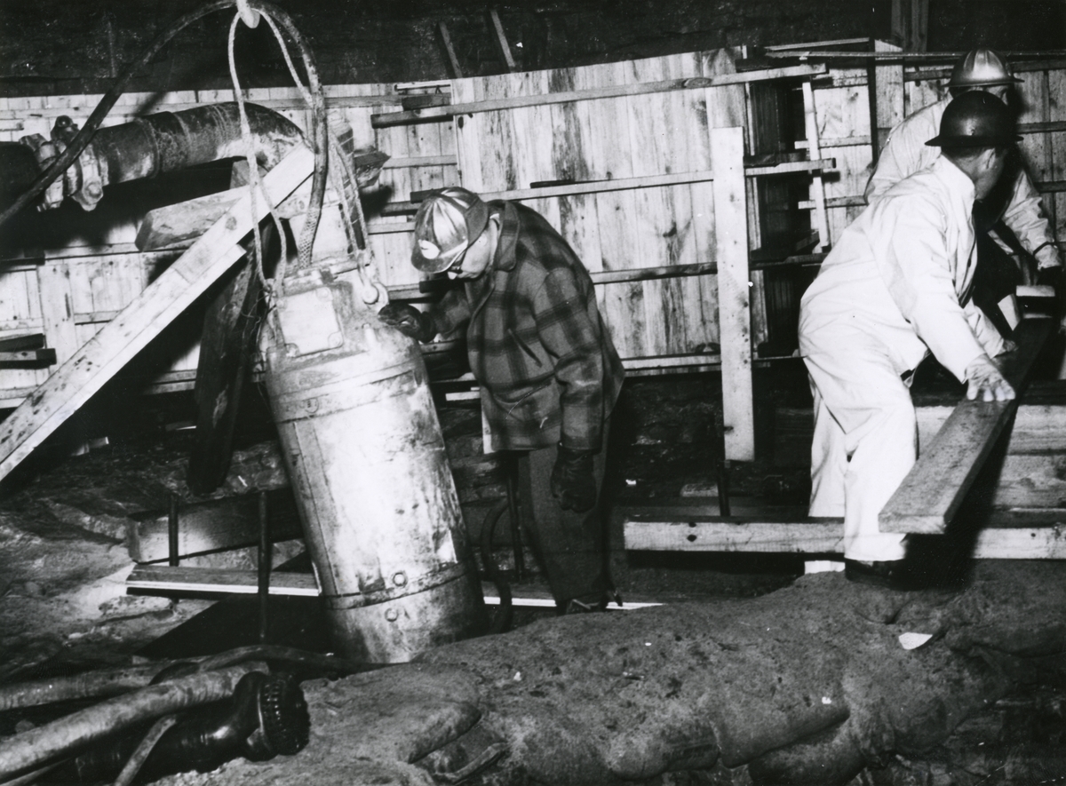 Arbetare vid en amerikansk raketbas sänker ner en Flyg-pump till det underjordiska schakt där raketen skall förvaras.