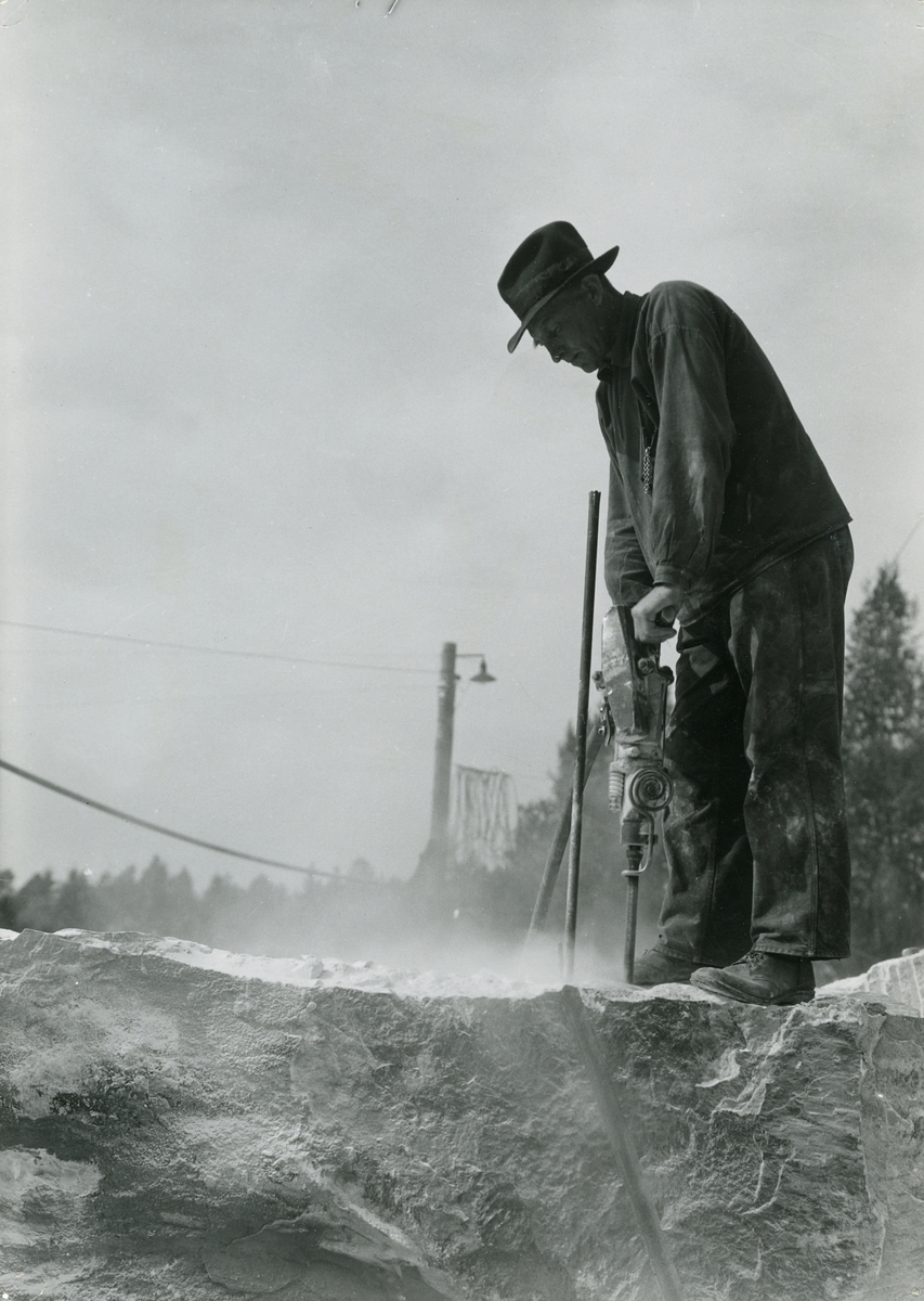 Med moderna tryckluftsmaskiner mejslar man ut marmorblocken ur fyndigheten Gropptorps Marmor AB.