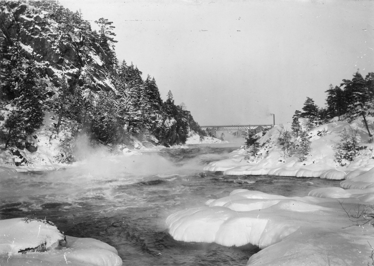 Helvetesfallen i Trollhättan vid 28 minusgrader. I bakgrunden syns Kung Oscars bro.