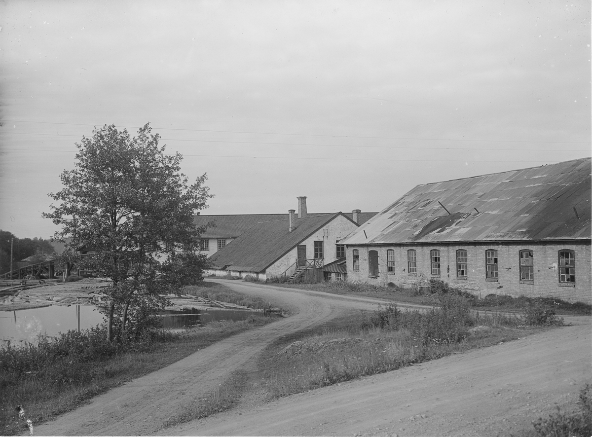Hargs bruk i Uppland. Nedre bruket. Längst till vänster sågverk, därnäst före detta vallonsmedjan byggd 1861, till vänster vallonsmedjan byggd 1893.