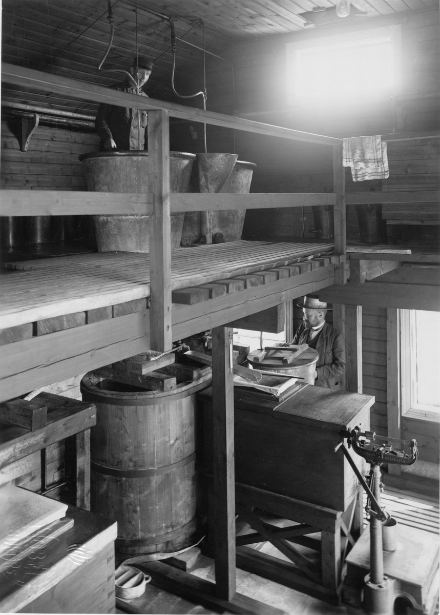 AB Bofors Nobelkrut. Nitroglycerinfabriken. Interiör av tvätthuset. På läktaren två blybehållare, i vilka oljan färdigtvättas. Den fyrkantiga lådan innehåller färdigtvättad nitroglycering. 1908.