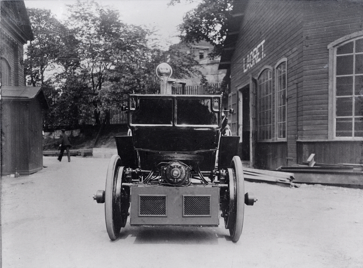 Den första i Sverige tillverkade elektriskt drivna automobilen. Konstuerad 1899 av Ing. Harald Håkansson i Västerås.