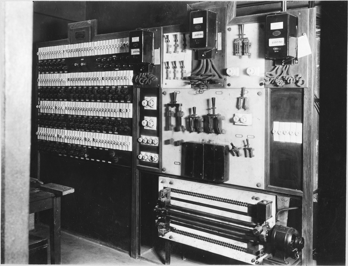 Interiör från biografen Röda Kvarns maskinrum. Elektriska anläggningen utförd av Elektriska Bolaget Poijes & Wettermark, Stockholm.