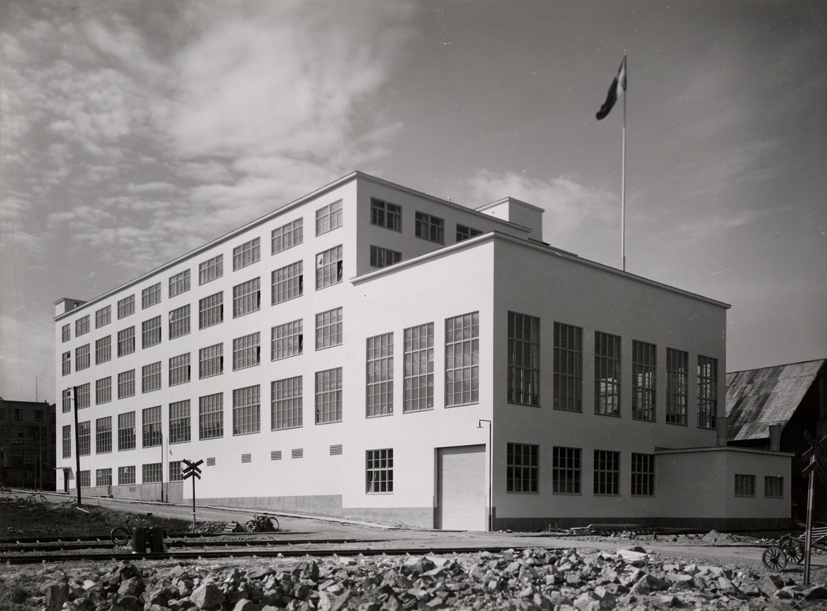 AB Asea Svetsmaskiners nya fabrilsbyggnad vid Hammarby industriområde, sedd från nordost.