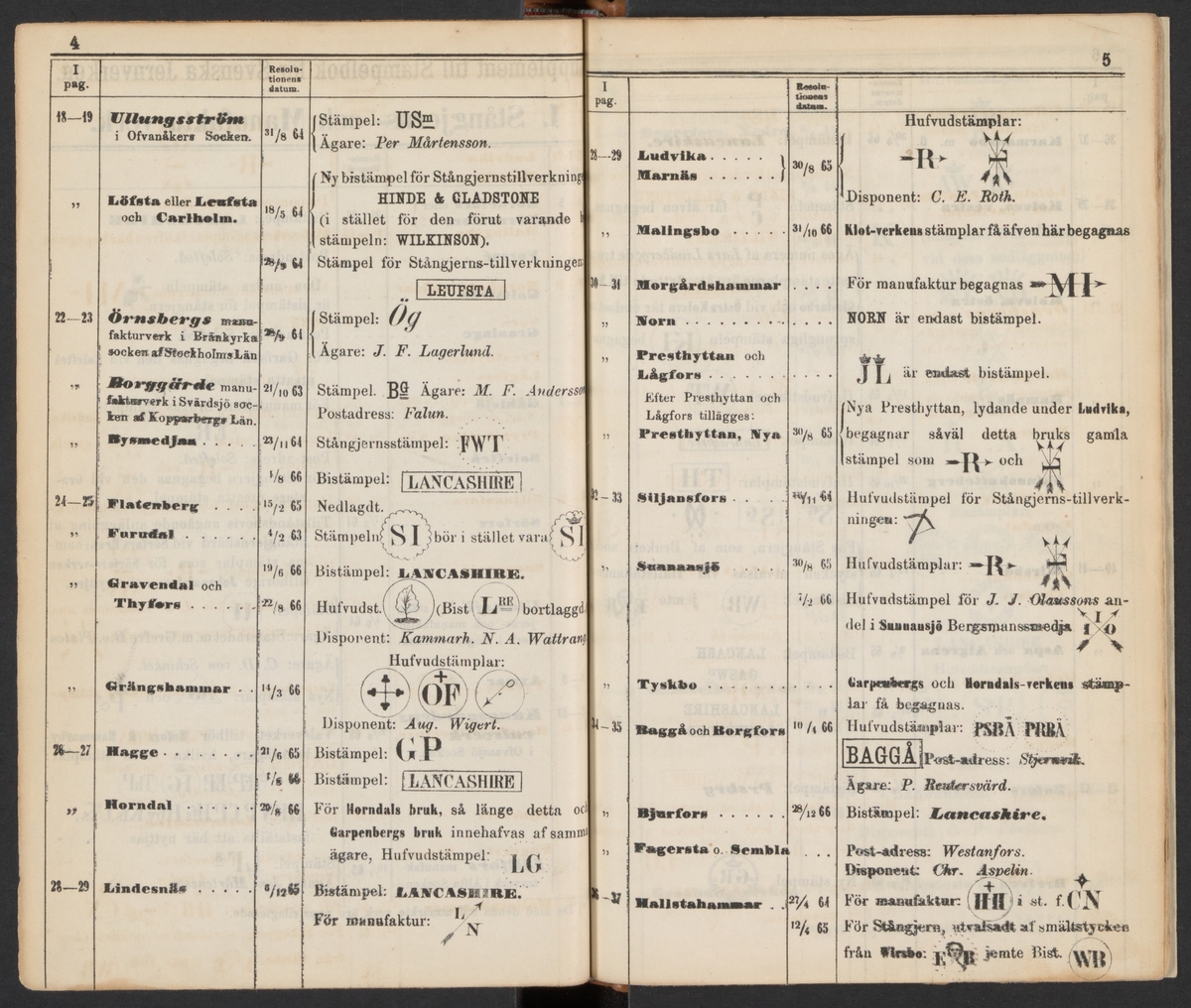 Titel: Stämpelbok för Svenska Järnverken 1864, med supplement 1867. Delvis handskrift. Ur Carl Sahlins bergshistoriska samling.