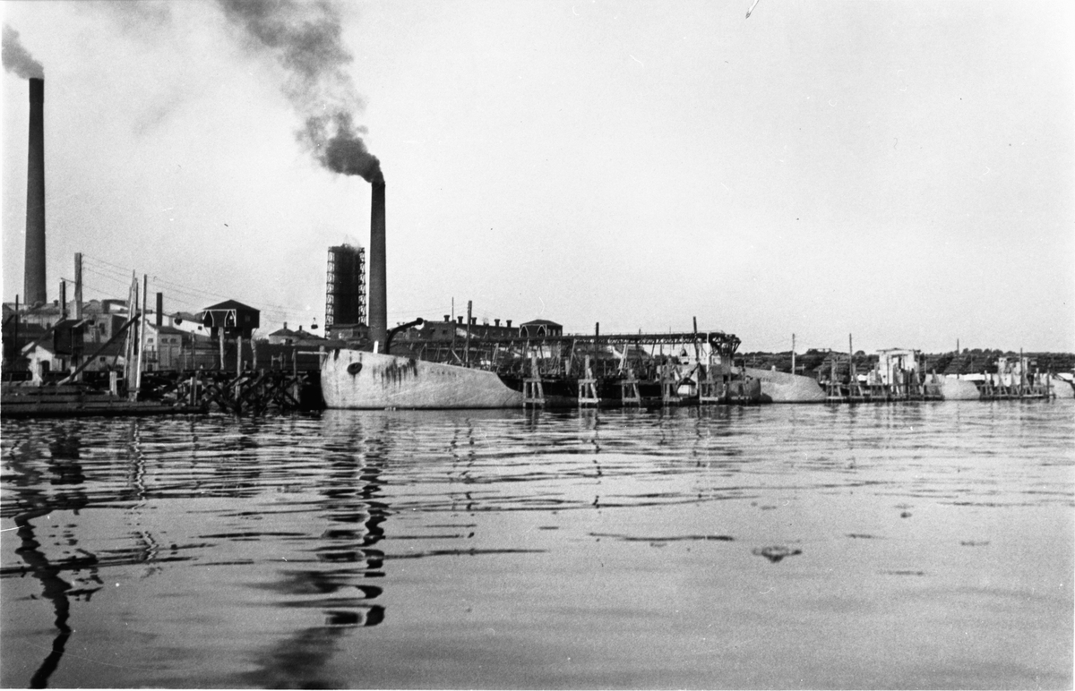 Byggherre: Byggnadsaktiebolaget Contractor, Stockholm. Betongfartyg till kaj.