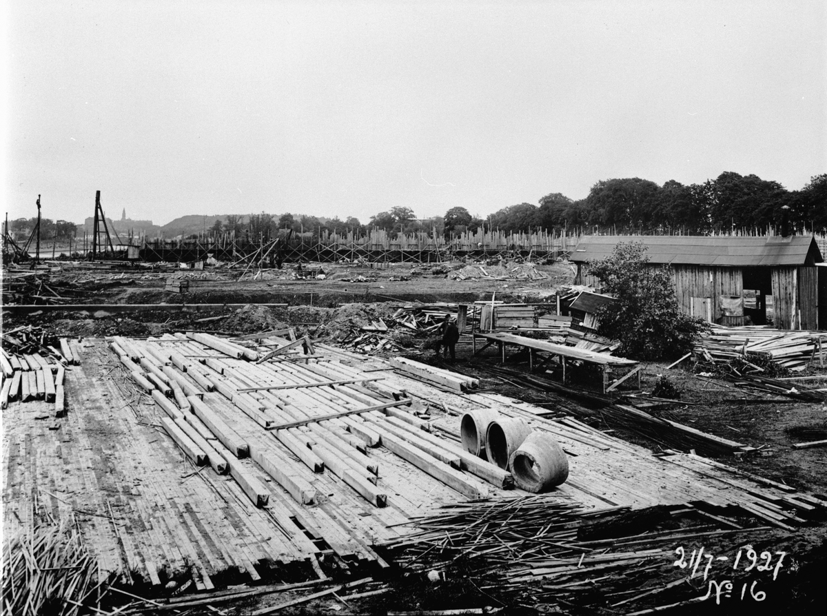 Titel: Byggherre: Bygnadaktiebolaget Contractor, Stockholm. General Motors Nordiska AB:s första fabriksbyggnad i Sverige. Arbetsbild. Hammarbyhamnen 1927.