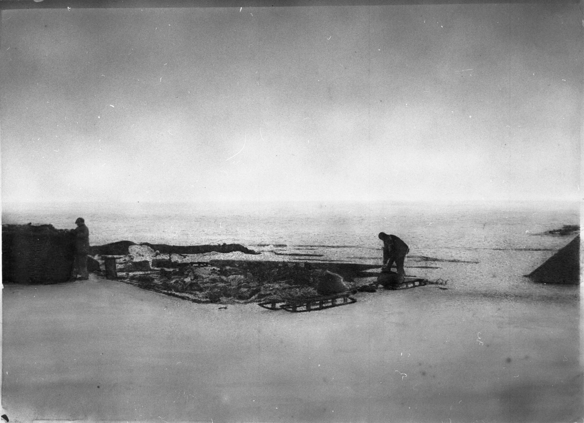 Den 15 - 19 juli 1897. Lägret vid "Örnens" landningsplats. Arbete med montering av båtens stomme. Framtagning av bilderna gjordes av docent John Hertzberg år 1930 på Fotografi, Tekniska Högskolan.