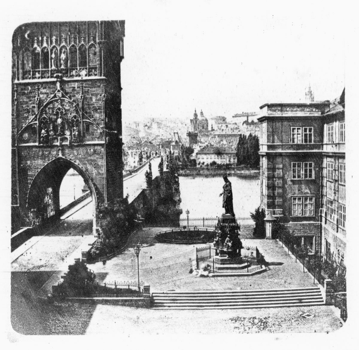Fotogravyr. Gjort efter ett collodiumnegativ på glas. Belyst genom ett hartsraster. Karlsbron över floden Moldau i Prag.