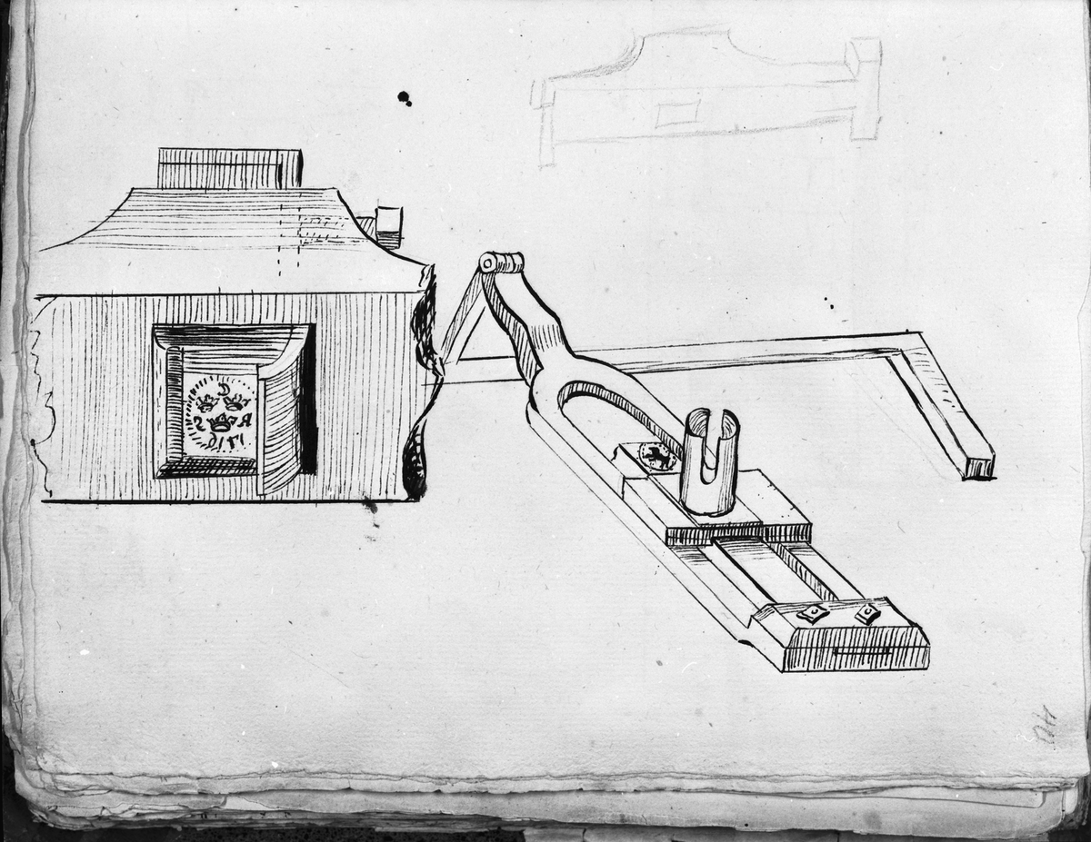 Skiss på Polhems myntmaskin. Ur Cronstedts skiss- och anteckningsbok från år 1729.