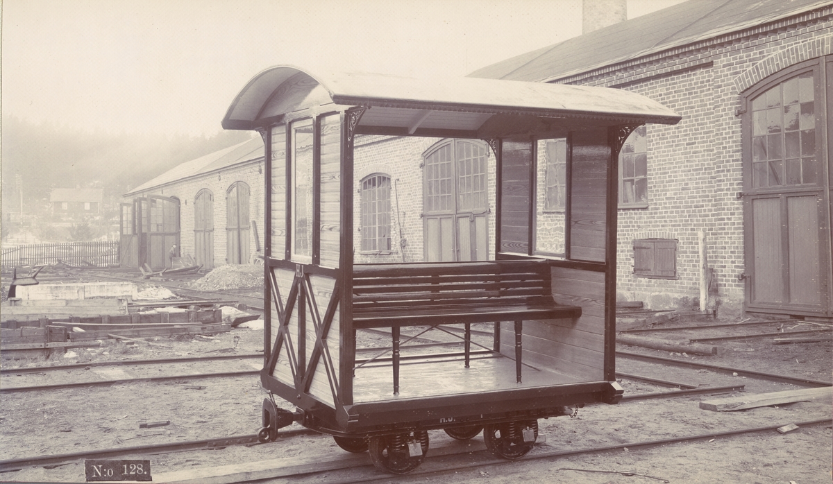 Tågvagn. Öppen personvagn. Ur album för Vagnfabriks Aktiebolaget i Södertälge.